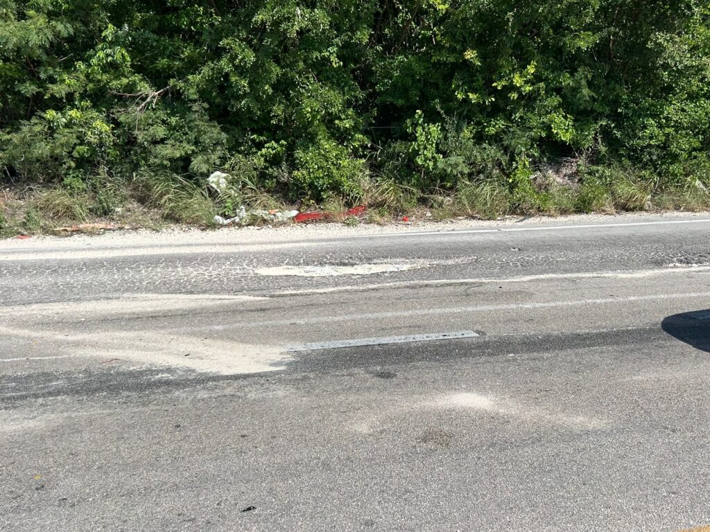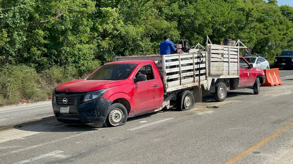 Playa del Carmen.- Una camioneta se estrelló contra el muro de contención de la carretera 307, en su tramo Puerto Morelos-Playa del Carmen, luego que uno de sus neumáticos estallara, al pasar por un bache que está cerca de la zona en la que se ubicaba un socavón.
