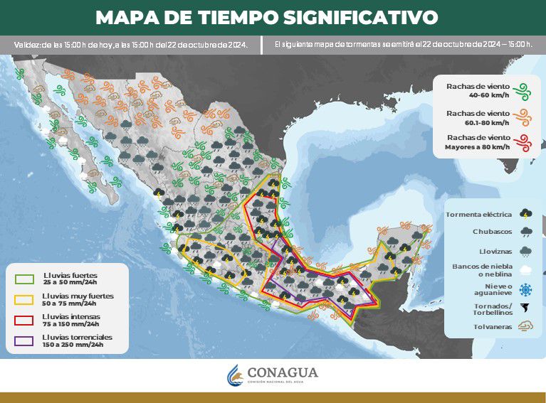 Un canal de baja presión extendido sobre el oriente y sureste de México aunado al ingreso de aire cálido y húmedo procedente del golfo de México y mar Caribe, ocasionarán lluvias con chubascos en el noreste, oriente, centro, sur y sureste del país, previéndose lluvias fuertes a muy fuertes en Guerrero, Puebla, Veracruz, Tabasco y Chiapas.