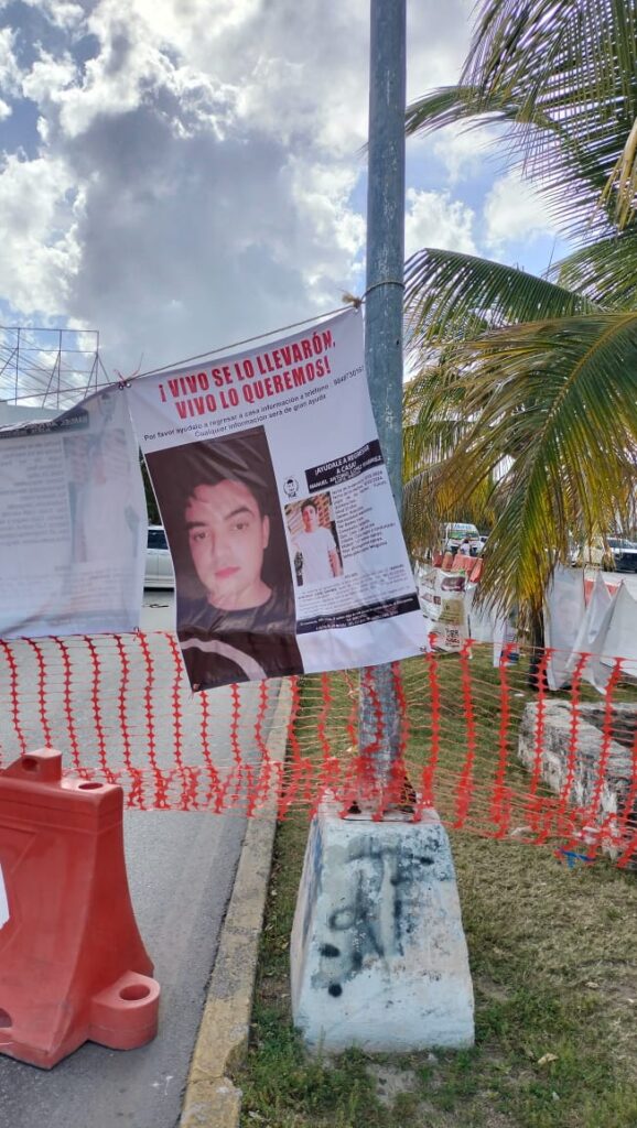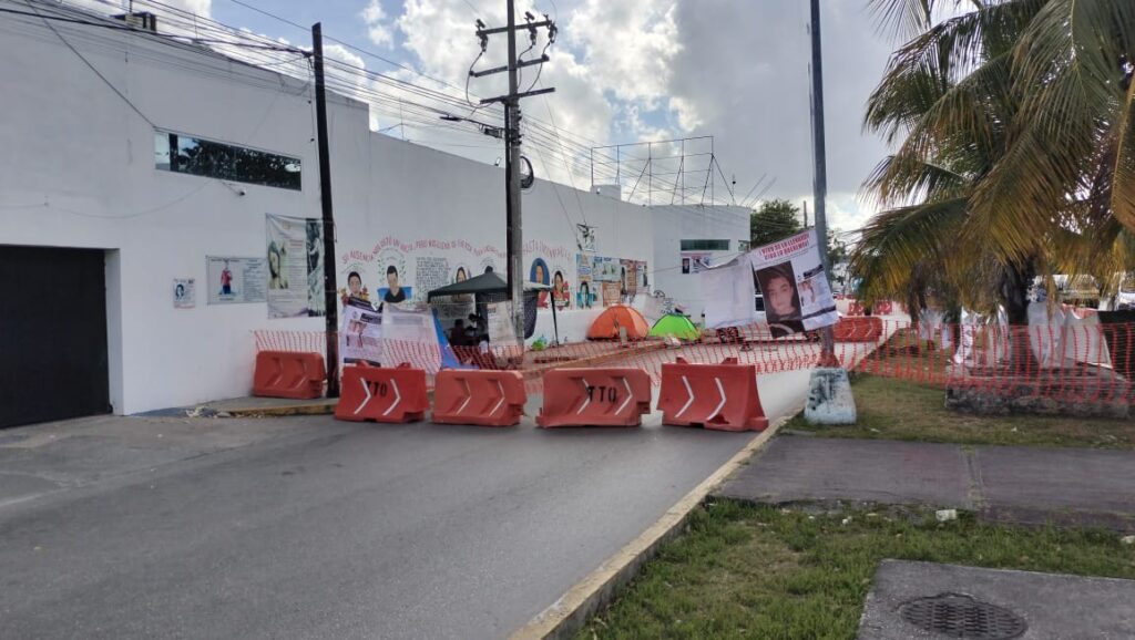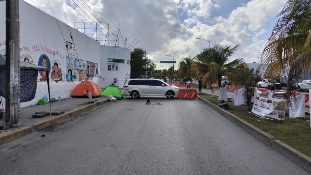 Las inconformes pusieron un tendedero sobre la avenida Xcaret con fotografías de personas desaparecidos, además de atravesar allí una camioneta particular. También instalaron varias tiendas de campaña, para pernoctar durante este plantón.