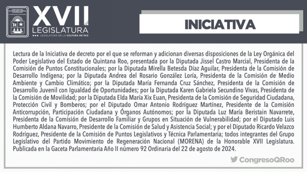 Las reformas que propone el Grupo Legislativo del Movimiento de Regeneración Nacional (Morena), tiene que ver al menos, en tres puntos: Igualdad de Género y Lenguaje Inclusivo, Parlamento Abierto, y modificación al artículo 23 de la Ley Orgánica al Poder Legislativo de Quintana Roo.