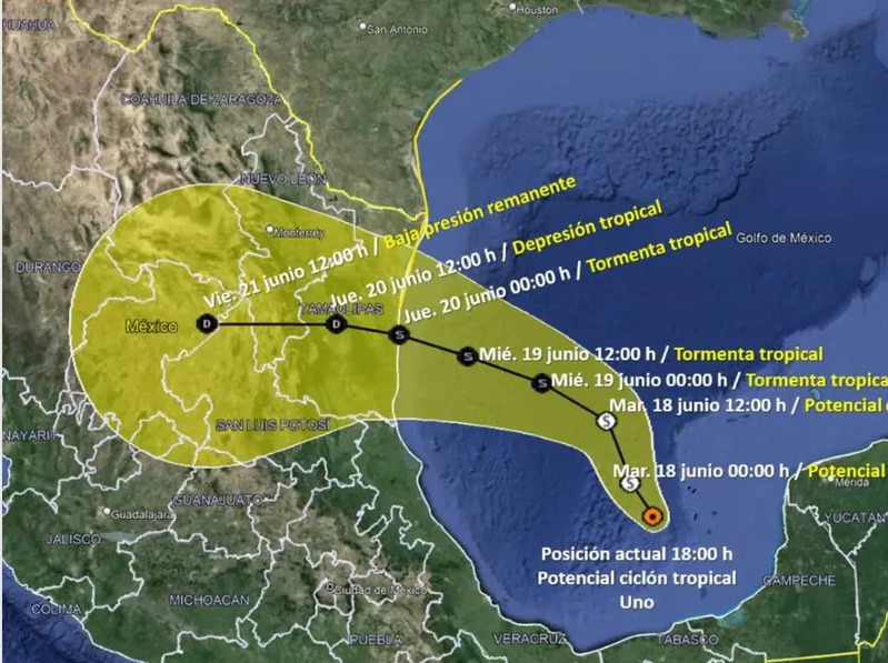 El Servicio Meteorológico Nacional (SMN) informó que un Potencial Ciclón Tropical Uno se desplazará sobre el Golfo de México este 18 de junio de 2024, lo que provocará lluvias intensas, vientos fuertes y posible formación de trombas marinas en varias regiones del país.