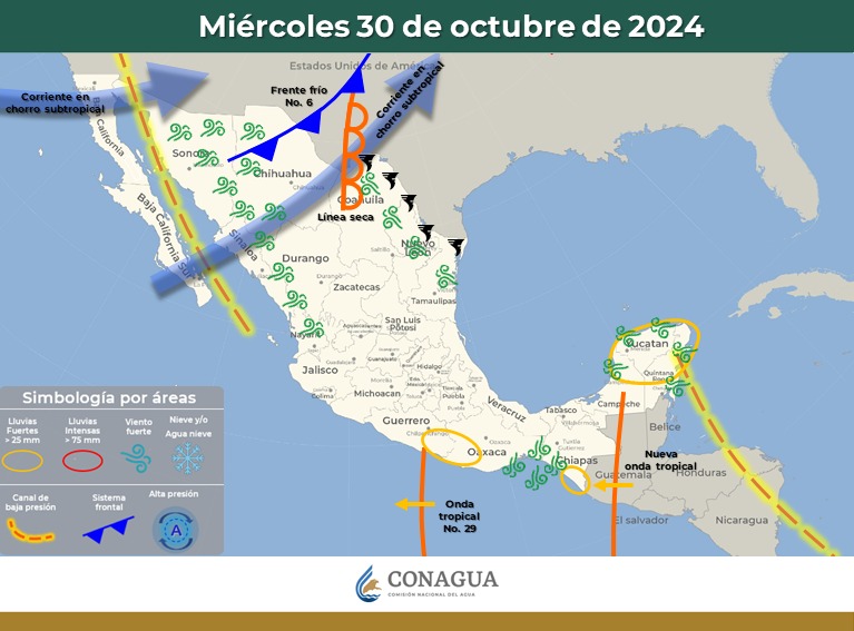 A su vez, el frente frío No. 6 se extenderá sobre el norte de México, continuará interactuando con la corriente en chorro subtropical y una línea seca, generando vientos muy fuertes en el noroeste, norte y noreste del territorio nacional, con posible formación de torbellinos en Coahuila, Nuevo León y Tamaulipas.