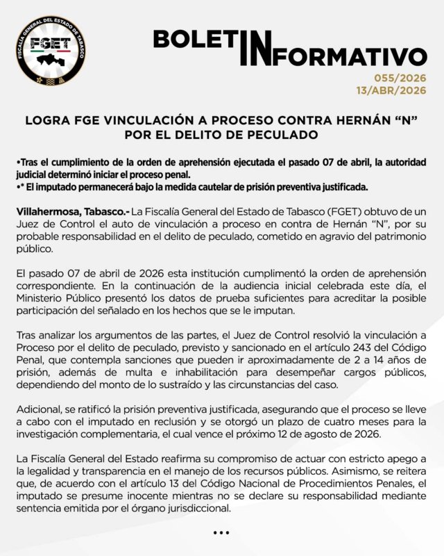 Villahermosa, Tabasco. La Fiscalía General del Estado de Tabasco anunció este lunes un avance significativo en el proceso judicial contra el exsecretario de Seguridad de la entidad. Un Juez de Control determinó el auto de vinculación a proceso en contra de Hernán “N”, por su presunta autoría en el delito de peculado. El exfuncionario fue señalado por afectar directamente el patrimonio público durante su gestión frente a las fuerzas del orden estatales. Por lo tanto, el Ministerio Público presentó los elementos probatorios necesarios para sustentar la acusación ante la autoridad jurisdiccional competente. Los equipos legales se preparan para enfrentar las etapas críticas del juicio por la corrupción en Tabasco que involucra a este exjefe policial.
