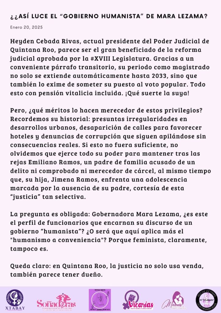 Cancún.- El Colectivo Femenil “Xtabay” publicó hoy en sus redes sociales un comunicado en el que cuestiona los supuestos “privilegios” que goza Heyden Cebada Rivas para continuar como magistrado presidente del Tribunal Superior de Justicia, a pesar de las reformas al Poder Judicial.