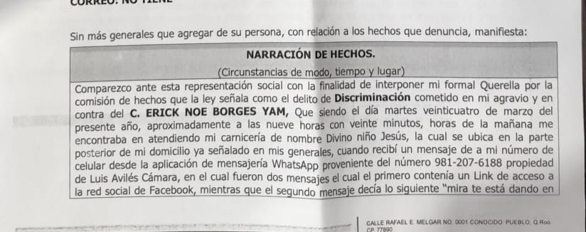 José María Morelos, QR. La administración municipal de José María Morelos enfrenta una nueva controversia jurídica tras la presentación de una querella formal ante la Fiscalía General del Estado. Joaquín Inurreta Canul, quien es un reconocido comerciante y exalcalde de la alcaldía de Dziuché, formalizó una denuncia contra Erick Borges Yam por el presunto delito de discriminación y calumnias. El conflicto se originó tras una serie de declaraciones emitidas por el edil morelense durante su programa radiofónico denominado “Día del Pueblo”, transmitido el pasado 24 de marzo. De acuerdo con el expediente con número de carpeta 158/2026, el presidente municipal utilizó el espacio público para cuestionar la calidad de los productos cárnicos que se ofrecen en el establecimiento del afectado, lo cual ha derivado en perjuicios económicos y sociales directos.