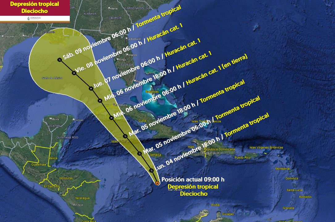 Chetumal.- La zona de baja presión en la región centro del mar Caribe se convirtió en la depresión tropical 18, a mil 300 kilómetros al este de Puerto Costa Maya, según información de la Comisión Nacional del Agua (Conagua).