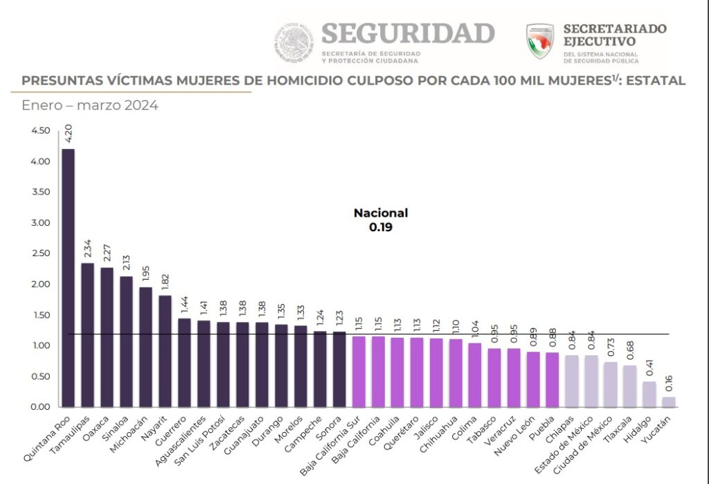 Exceptuando a los feminicidios, Quintana Roo continúa como el primer lugar a nivel nacional, per cápita, en violencia contra las mujeres en el renglón de homicidio culposo, trata de personas, violación y violencia de pareja, según cifras publicadas hoy por el Secretariado Ejecutivo del Sistema Nacional de Seguridad Pública (SESNSP).