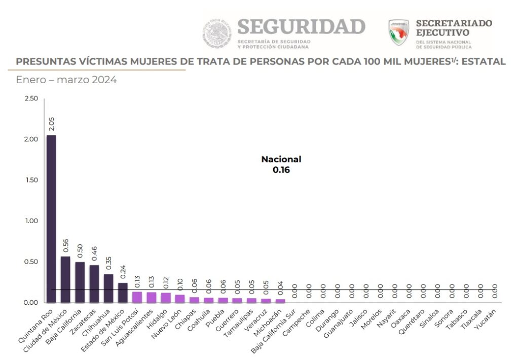 De igual forma, las recientes detenciones de bandas dedicadas a la trata de personas y el rescate de las mujeres ubicaron a Quintana Roo como el primer lugar por cada 100 mil mujeres, al presentar 2.05 de incidencia, con sus 21 casos en lo que va del año.