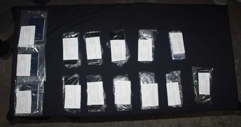 Durante el operativo fueron asegurados celulares, además de tres pasaportes de la República de el Salvador, cinco automóviles y una motocicleta.