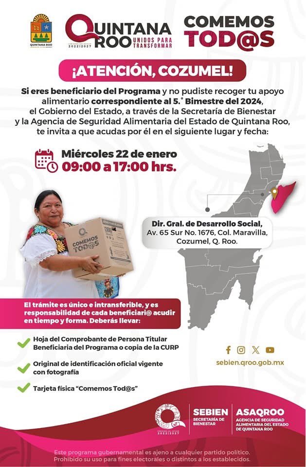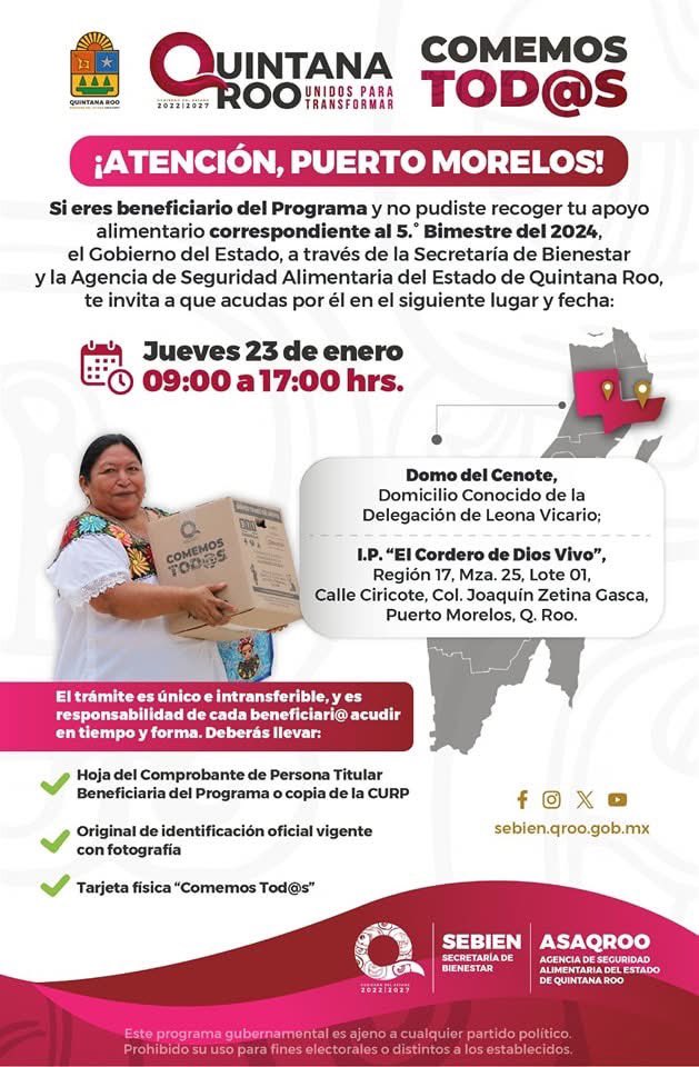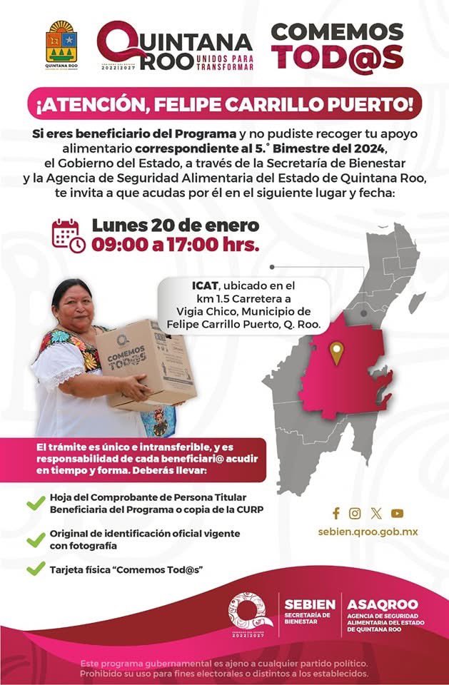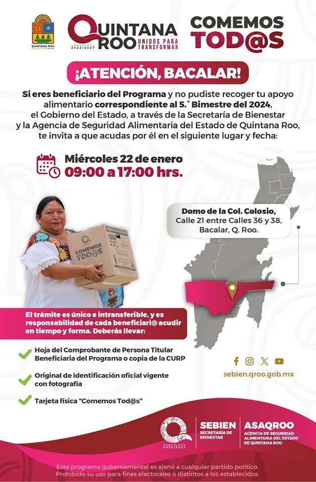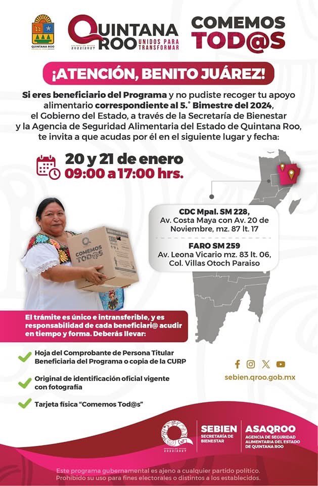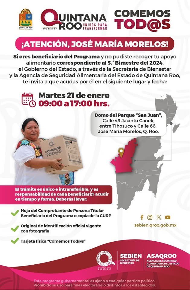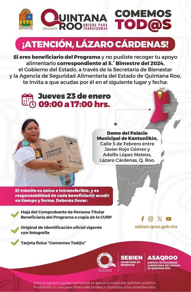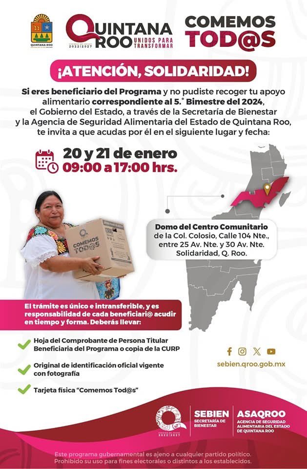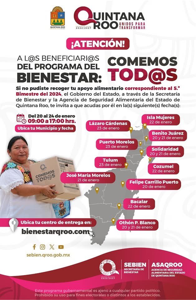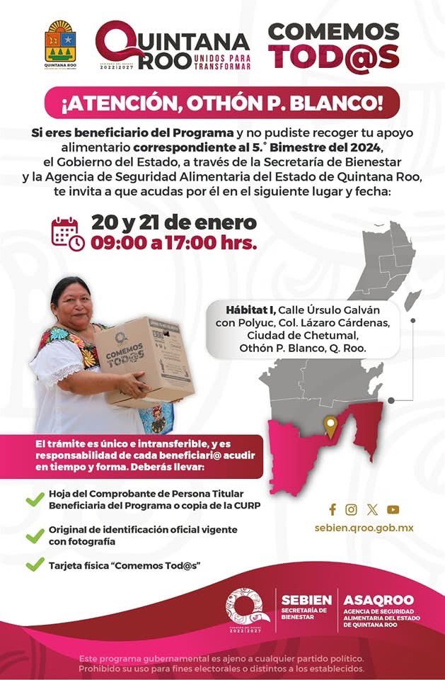 Las despensas serán entregadas por la Secretaría del Bienestar y la Agencia de Seguridad Alimentaria del Estado de Quintana Roo; de acuerdo con el calendario, la dispersión será del 20 al 24 de enero, en horario de 09:00 de la mañana a las 05:00 de la tarde. Para recibir el apoyo, deberán presentar hoja del comprobante que es titular del programa o su CURP, original de identificación oficial vigente y la tarjeta física de “Comemos Todos”.