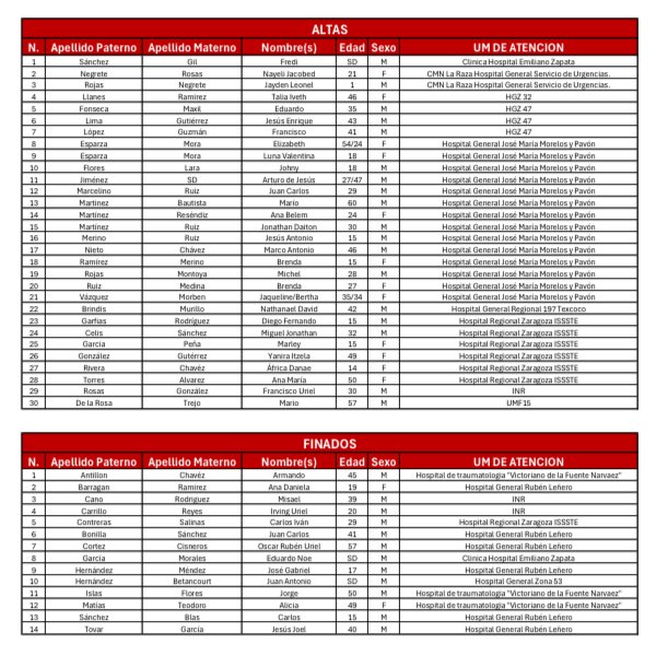 La víctima más reciente es Jesús Joel Tovar García, de 40 años, quien estaba hospitalizado en el Rubén Leñero y cuyo nombre ya aparece en la lista de personas finadas. Hasta el sábado, aún figuraba como hospitalizado.