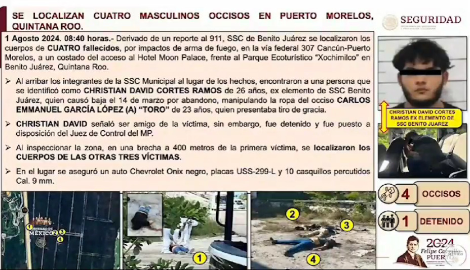 El pasado 2 de agosto, las autoridades federales dieron a conocer la identidad del policía que fue encontrado ejecutado, junto con otros tres individuos, en el tramo carretero entre Puerto Morelos y Cancún. Se trata de Crhistian David Cortés Ramos, de 26 años de edad, ex elemento de la Secretaría de Seguridad Ciudadana de Benito Juárez, dado de baja el año pasado de manera voluntaria, quien fue hallado manipulando la ropa del oficial occiso.