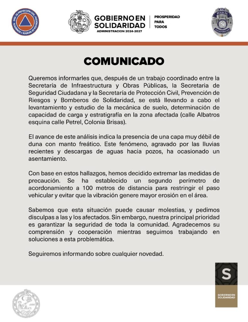 Mediante un comunicado, el Ayuntamiento de Solidaridad informó que personal especializado está llevando a cabo el levantamiento y estudio de la mecánica de suelo, así como la determinación de capacidad de carga de la zona afectada.