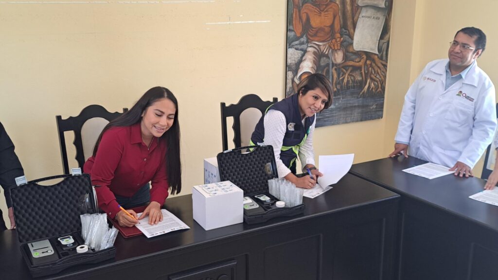 Durante el acto de entrega también realizaron una demostración de cómo usar correctamente el dispositivo y la colocación de los insumos correspondientes para realizar la prueba.