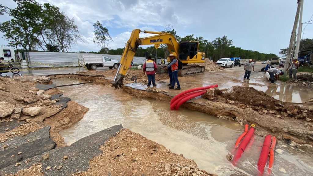 Playa del Carmen, QR. La empresa desarrolladora Cadu provocó este martes un grave incidente en la infraestructura hidráulica de Solidaridad al fracturar accidentalmente una tubería de amplio flujo. El percance ocurrió mientras las cuadrillas de la constructora ejecutaban maniobras de interconexión para un complejo habitacional que se edifica en el cruce de las avenidas Lilis y Constituyentes. Los operarios de la compañía inmobiliaria realizaban una excavación profunda para localizar la red de suministro, sin embargo, la presión de la maquinaria terminó por colapsar el ducto frente al sector de InHouse. Por consiguiente, miles de litros de líquido vital inundaron las vialidades circundantes, generando una contingencia mayor por la fuga en Playa del Carmen.