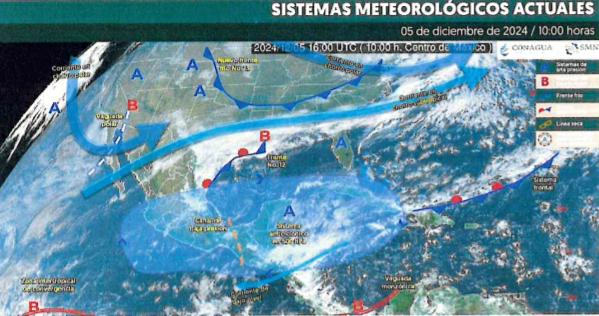 A su vez, una vaguada extendida sobre el noroeste de México, asociada con la corriente en chorro polar, generará descenso de temperatura en dicha región, así como vientos de 15 a 25 km/h con rachas de 30 a 50 km/h en Sonora.