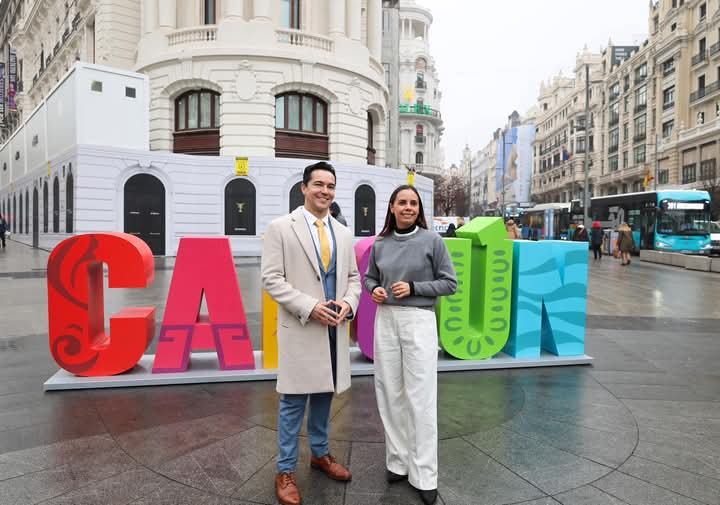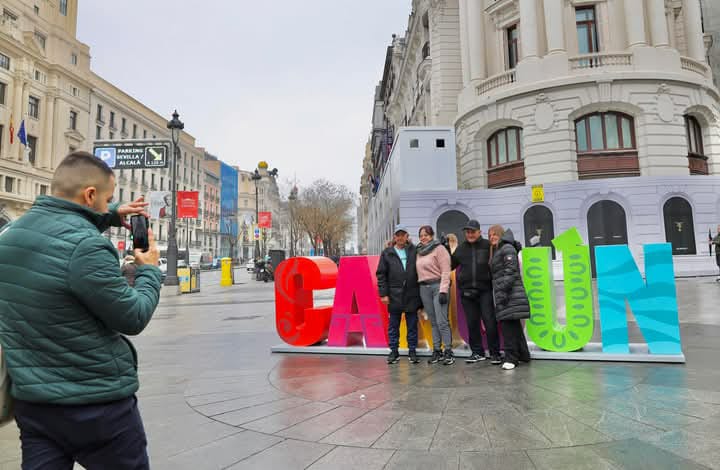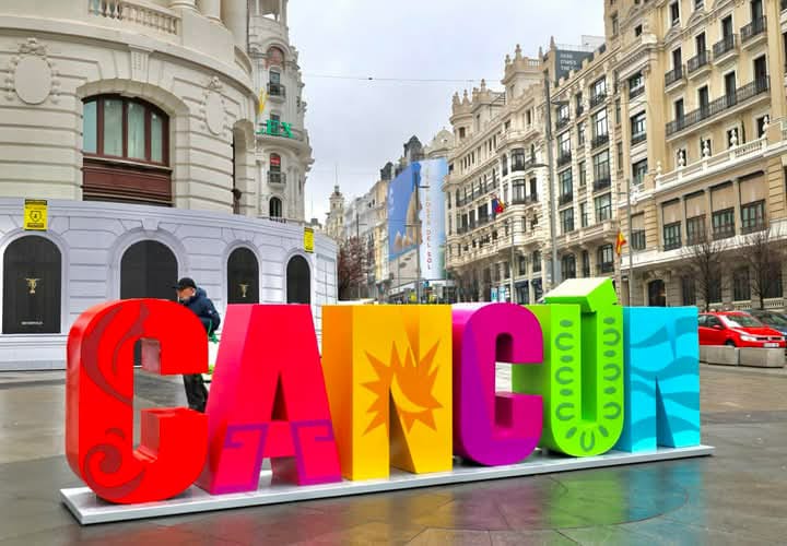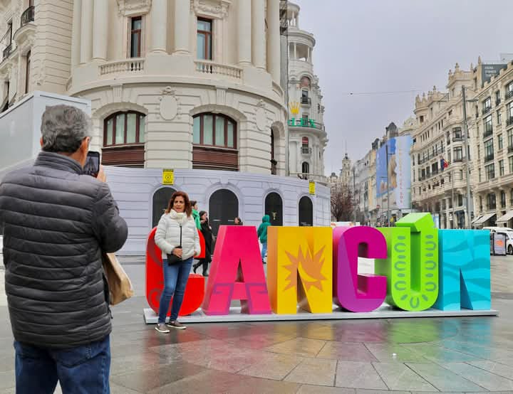 Cancún.- Como parte de una estrategia promocional en el marco de la Feria de Turismo (Fitur) 2025, las emblemáticas letras que forman la palabra Cancún fueron instalado en la Gran Vía de Madrid, donde diariamente transitan más de 300 mil personas.