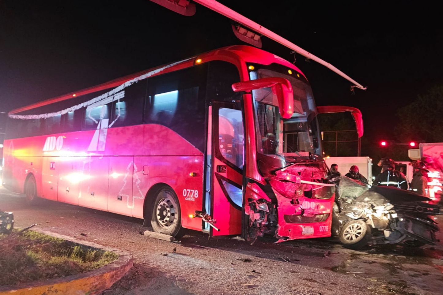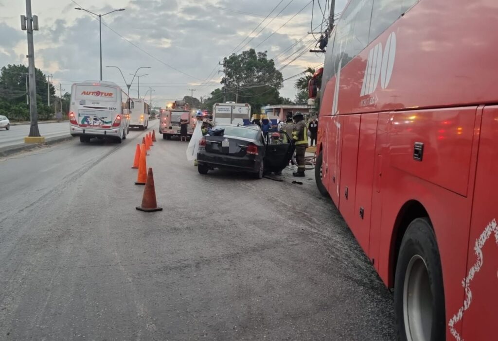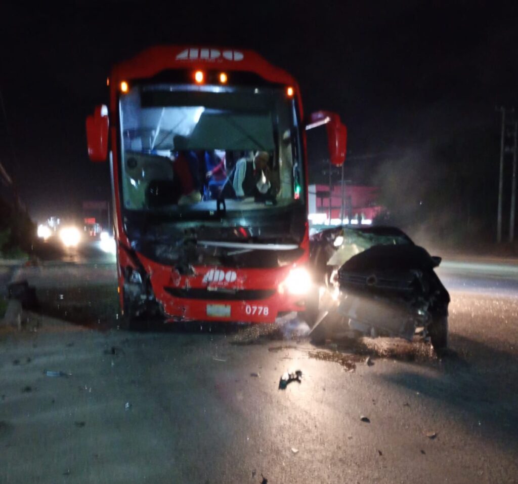 En sentido opuesto, es decir hacia el centro de Cancún, llegaba la unidad de pasaje de la empresa ADO, con número económico 0778, cuyo conductor no logró esquivar al vehículo impactándolo en el costado.