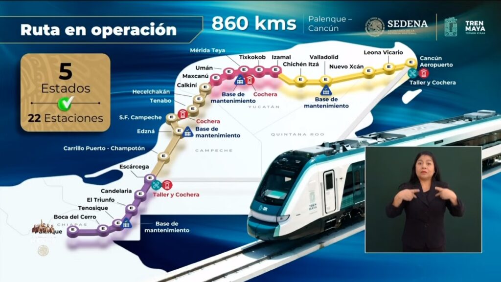 En la misma conferencia, representantes de las empresas constructoras brindaron detalles sobre los distintos tramos del Tren Maya, a partir del Tramo 1, que inicia en Palenque, que ya está concluido, con todo y sus estaciones. Personal de la Sedena también brindó pormenores del Tramo 5 Sur, todavía en construcción.