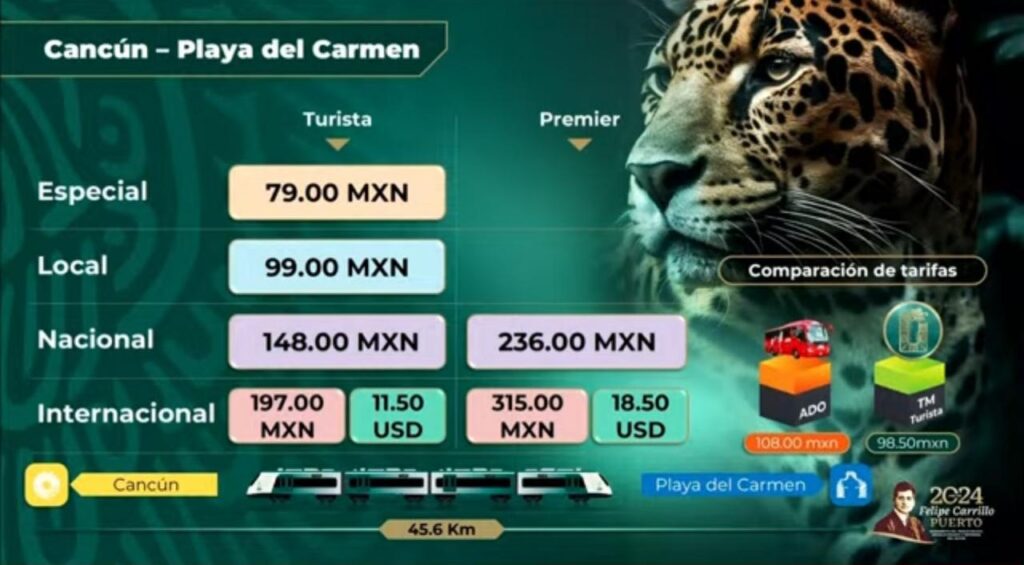 Estos viajes especiales, que tendrán una tarifa reducida de 79 pesos por pasajero, saldrán de Cancún a las 6 y 17:30 horas, e irán de regreso desde Playa del Carmen a las 7:30 y 19 horas. Las salidas comerciales serán a las 9, 12 y 15 horas desde Cancún, y a las 10:30, 13:30 y 16:30 horas desde Playa del Carmen. Estos viajes se harán en ferrocarriles con cuatro vagones, con capacidad de 2 mil 210 pasajeros.