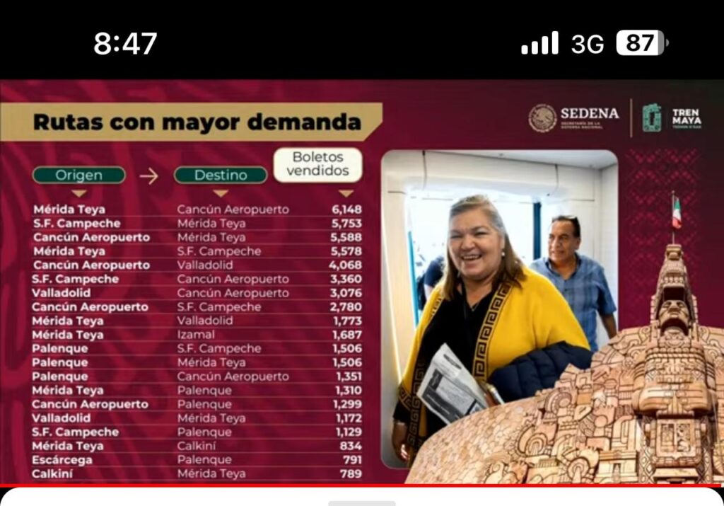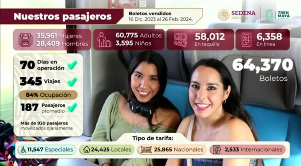 A nivel general, el Tren Maya ya cuenta con 22 estaciones. En sus 70 días de operaciones ha vendido 64 mil 370 boletos, para brindar 375 viajes con un 84% de ocupación promedio. De los distintos trayectos, el viaje Cancún-Mérida es el más popular, seguido de cerca por la conexión Mérida-Campeche.