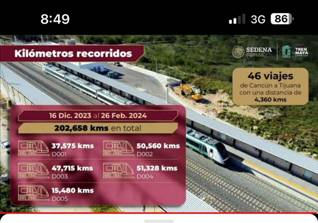 En total, estos ferrocarriles han recorrido 202 kilómetros, lo que es equivalente a 46 viajes de Cancún a Tijuana.