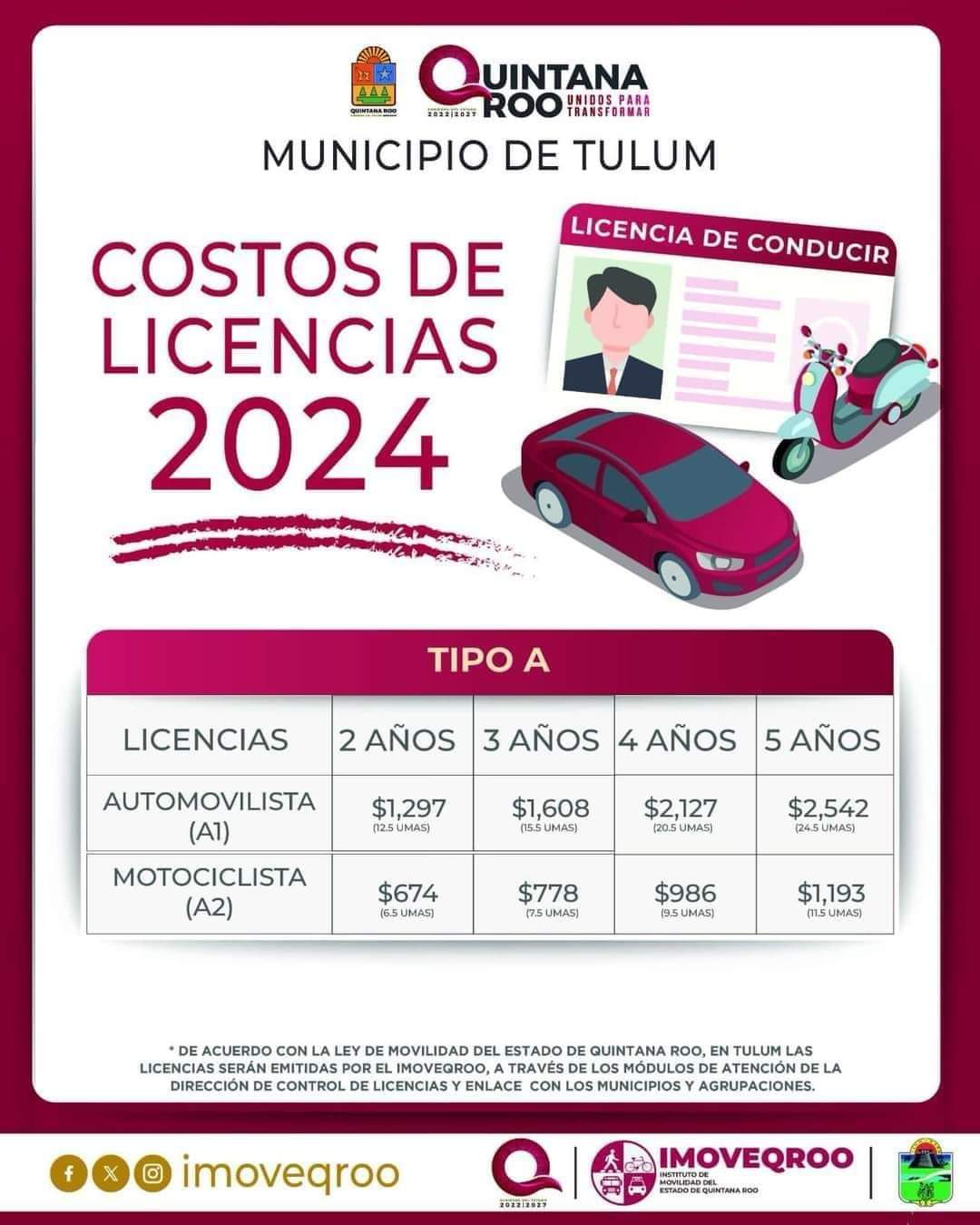 Cabe señalar que los costos en esta ciudad para la licencias de conducir con vigencia de dos años para automovilistas es de mil 297 pesos; mil 608 pesos para tres años; dos mil 127 pesos para cuatro años y dos mil 542 pesos para cinco años.