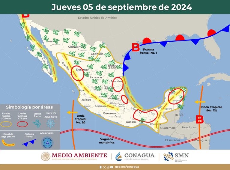 Por su parte, la onda tropical No. 20 se extenderá frente a las costas de Jalisco y reforzará la probabilidad de lluvias en el occidente del país. Se prevé que el sistema continúe avanzando hacia el oeste y al final del día deje de afectar al territorio nacional.