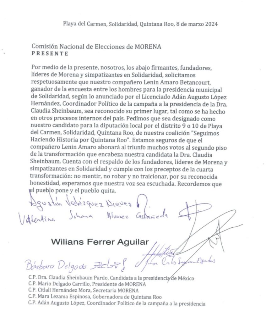 Lo anterior,, mediante una carta que fue enviada a las oficinas centrales de Morena, donde morenistas que se definen como fundadores y líderes de este partido, solicitaron dicha posición para el aspirante, “por haber ganada la encuesta entre los hombres para la presidencia municipal de Solidaridad”.