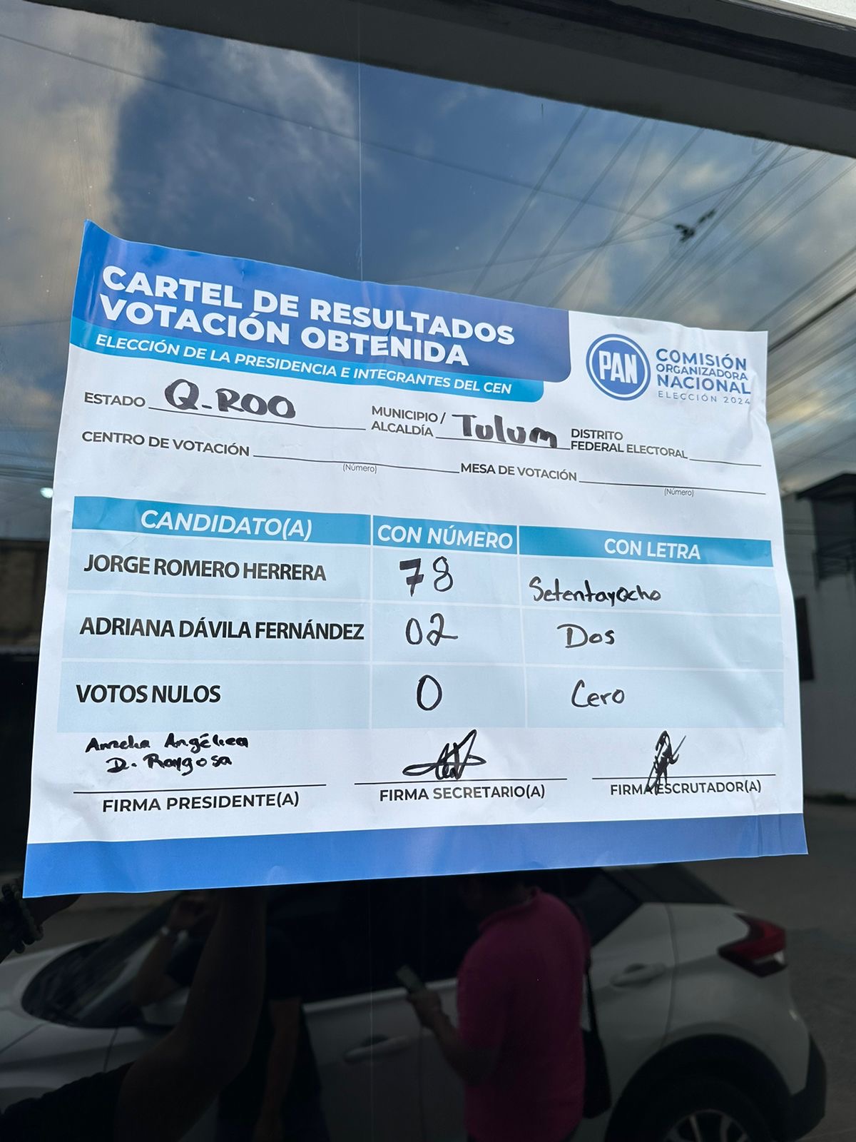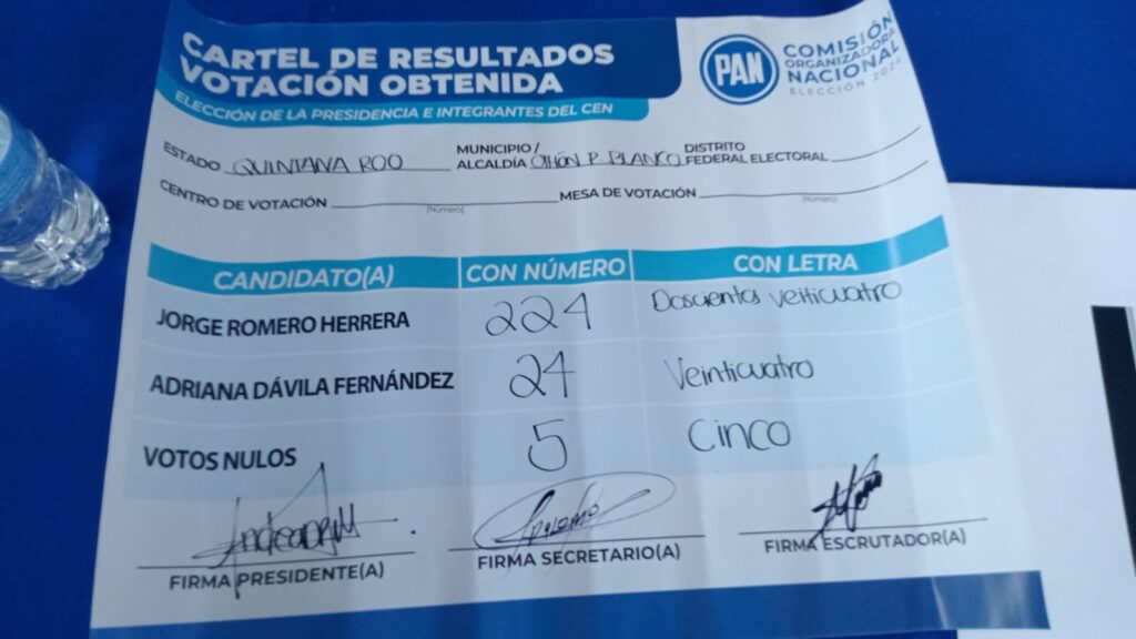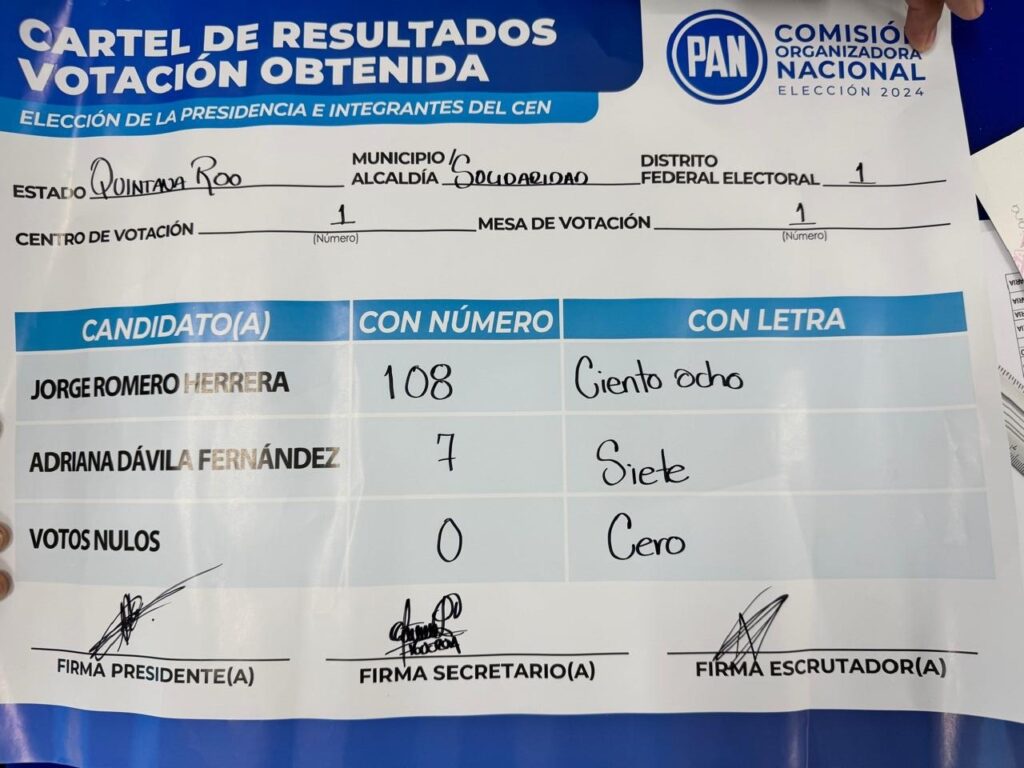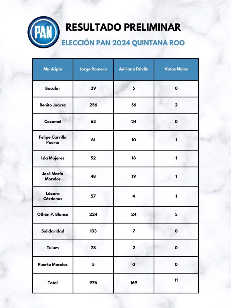 Su contrincante, Adriana Dávila, cuenta con 169 votos, de acuerdo con el resultados preliminares que ha dado a conocer el PAN Quintana Roo mediante un comunicado.