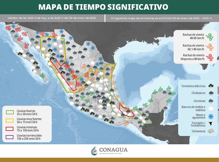Por otra parte, un nuevo frente frío se aproximará e ingresará al noreste del territorio nacional, interaccionará con un canal de baja presión extendido sobre el occidente del golfo de México, propiciando lluvias puntuales fuertes en Nuevo León y Tamaulipas, así como intervalos de chubascos en San Luis Potosí y Veracruz, además de rachas de viento de 70 a 90 km/h en Nuevo León y San Luis Potosí.