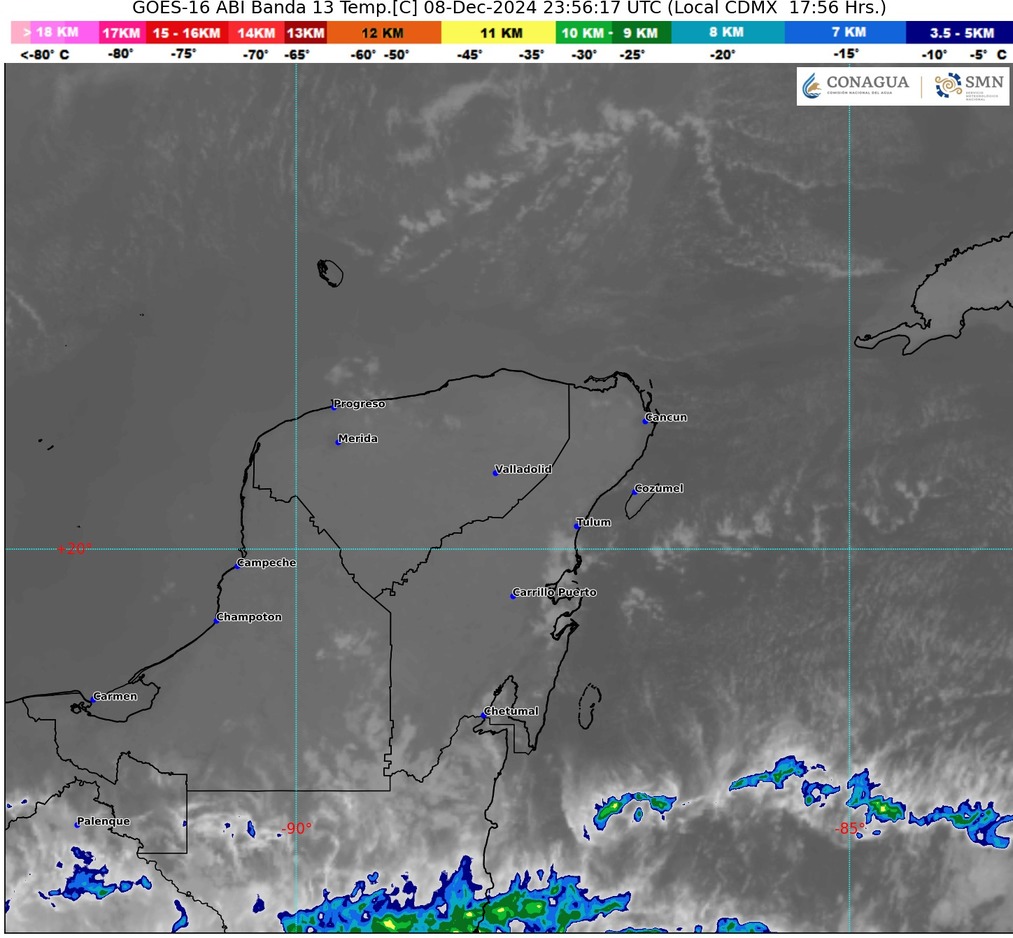 Agrega que el ambiente será templado por la mañana y cálido a caluroso por la tarde, con temperaturas máximas de 30 a 35 grados centígrados; viento de componente este de 10 a 20 km/h con rachas de hasta 40 km/h en las costas de Yucatán.