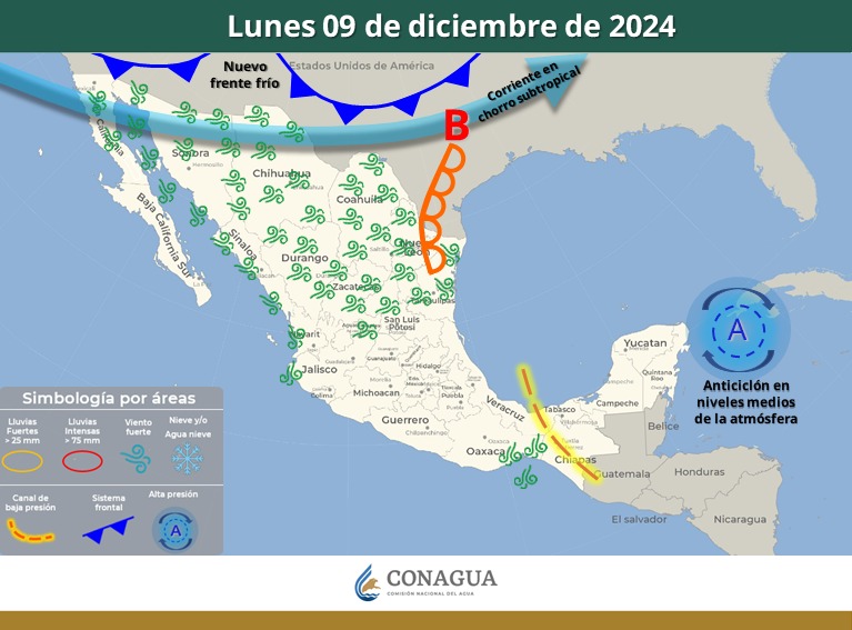 Además, se pronostica la aproximación de un nuevo frente frío al noroeste y norte del país, en interacción con las corrientes en chorro polar y subtropical, ocasionará vientos fuertes con posibles tolvaneras en el noroeste y norte del territorio nacional.