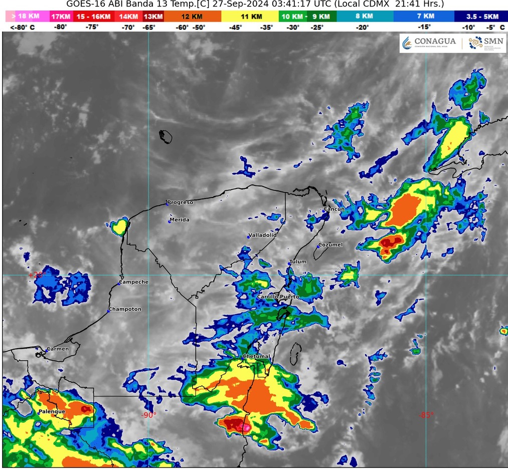 Chetumal.- Para hoy, en la Península de Yucatán habrá cielo nublado durante el día con lluvias puntuales muy fuertes en Campeche y fuertes en Yucatán y Quintana Roo, todas con descargas eléctricas y podrían generar encharcamientos e inundaciones; viento de dirección variable de 15 a 30 km/h en la región.