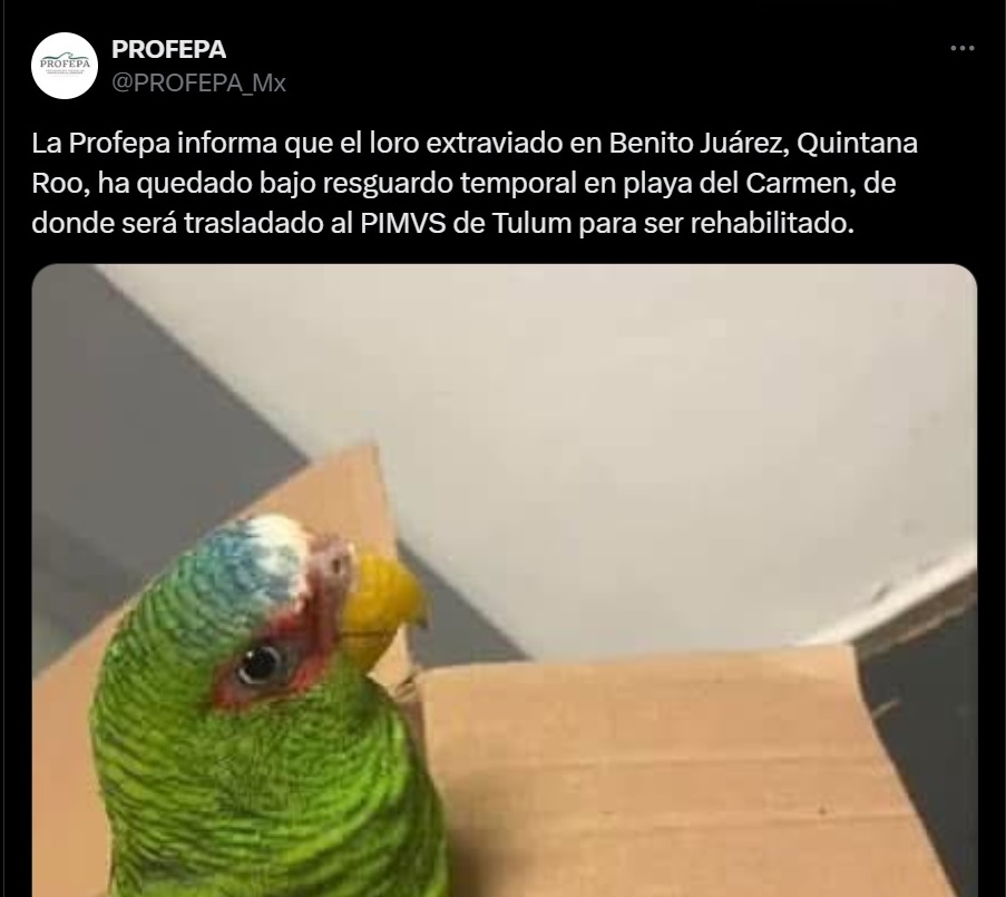 Los hechos ocurrieron el pasado 2 de enero, cuando el loro desapareció de una casa particular, pero fue encontrado en árboles de la vía pública, de acuerdo con lo expuesto por la dependencia federal; “La Profepa informa que el loro extraviado en Benito Juárez, Quintana Roo, ha quedado bajo resguardo temporal en Playa del Carmen, de donde será trasladado al PIMVS (Predio o Instalación que Maneja Vida Silvestre) de Tulum para ser rehabilitado”.