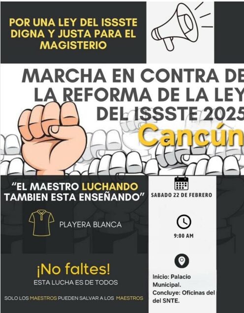 La iniciativa de reforma a la Ley del Instituto de Seguridad y Servicios Sociales de los Trabajadores del Estado (ISSSTE), presentada el 7 de febrero de 2025 por la presidenta Claudia Sheinbaum Pardo, ha desatado una ola de descontento entre los maestros de México. En respuesta, los educadores de Quintana Roo se han unido a las protestas que se llevan a cabo en varias entidades, incluyendo Oaxaca, el Estado de México, la Ciudad de México, Jalisco y Michoacán, organizando una marcha programada para el próximo 22 de febrero.