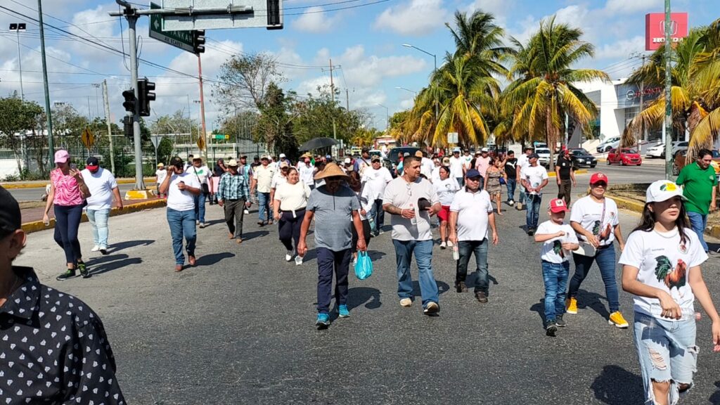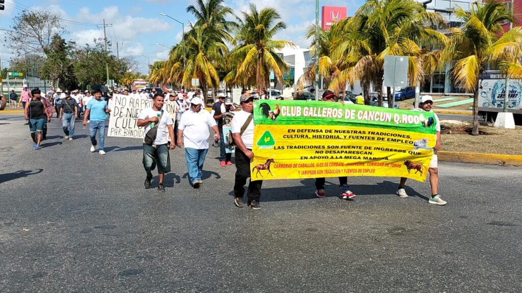 Al grito de “Sí a los gallos, sí a los toros”, “No a la prohibición de los gallos” y “No queremos políticos corruptos que no apoyan nuestras tradiciones”, entre otras cosas, los inconformes, entre los que también se encontraban asociaciones de charrería y jaripeos, marcharon desde las instalaciones de la Fiscalía General del Estado hasta llegar a la glorieta del Ceviche y finalmente al Ayuntamiento.