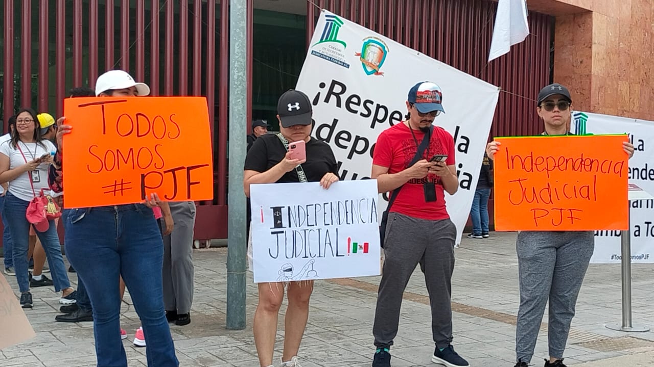 Personal de los tribunales federales ubicados en la avenida Andrés Quintana Roo se manifestaron afuera de estas instalaciones, con cartulinas y lonas en las que escribieron leyendas como “Respeto a la independencia judicial”, “Yo cuido de tus derechos, por eso ahora defiende los míos”, o “Sin el PJF, ¿quién te va a amparar?”, entre otros.