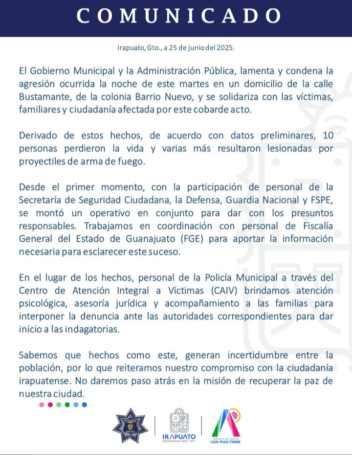 IRAPUATO. Ayer, una nueva masacre. 10 muertos. Qué van a decir ahora, cómo le echarán la culpa al PAN si apenas ayer presumían que la seguridad en Guanajuato era su responsabilidad? pic.twitter.com/ZaVywpiNyw