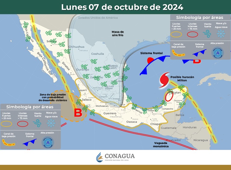 “Milton” continuará desplazándose sobre el golfo de México, como posible huracán mayor, su amplia circulación originará lluvias intensas en Campeche y Yucatán, lluvias muy fuertes en Veracruz, Tabasco y Quintana Roo.