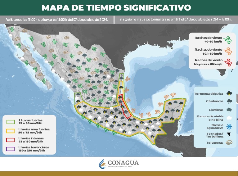 A su vez, se pronostican vientos con rachas de 40 a 60 km/h y oleaje de 1 a 2 metros de altura en las costas de Michoacán, Colima y Jalisco.
