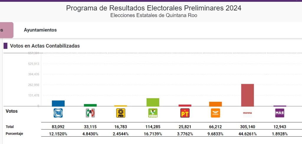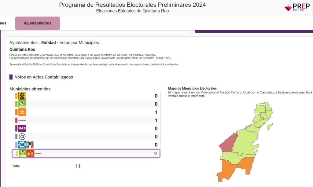 En los ayuntamientos, con un 90.4914 por ciento de las actas capturadas, la alianza de Morena-PVEM-PT estaría ganando en nueve ayuntamientos, mientras que Morena en solitario ganó un décimo municipio. El ayuntamiento restante, Othón P. Blanco, sería para Movimiento Ciudadano, aunque, al corte de las 9 de la mañana, la diferencia entre ambas fuerzas es de apenas un 2%.