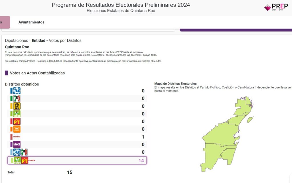 Chetumal.- La coalición “Juntos Seguimos Haciendo Historia” cuenta, a excepción de Othón P. Blanco, con una ventaja considerable en las candidaturas que estuvieron en juego en las elecciones de este 2 de junio, a menos del 10 por ciento de que terminen de ser computadas las 2 mil 593 actas recibidas en el consejos distritales del Instituto Electoral de Quintana Roo (Ieqroo).