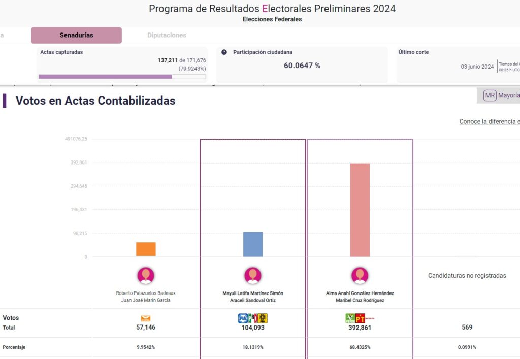 En cuanto a senadurías, los resultados señalan que el candidato de MC, Roberto Palazuelos Badeaux, no alcanzaría a colocarse en el segundo lugar de la elección, sino que la panista Mayuli Martínez Simón, candidata de la coalición PAN-PRI-PRD, se quedaría con esa posición y con la senaduría de primera minoría que otorga esta elección.