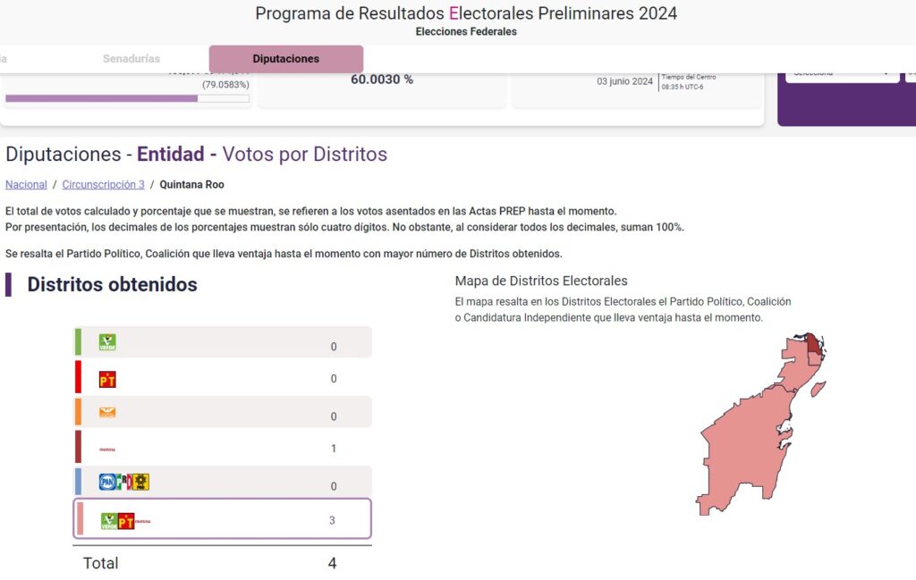 En cuanto a las cuatro diputaciones federales de mayoría relativa, la coalición Morena-PT-PVEM aventaja en los distritos 1, 2 y 4 que están representados por Juan Carrillo Soberanis, Elda Xix Euán y Mildred Ávila Vera, mientras que el “partido guinda” lo hace en solitario en el distrito 3, con Humberto Aldana Navarro.