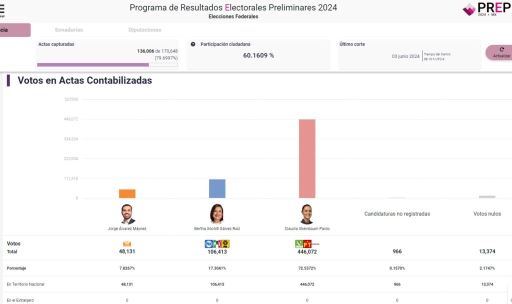 En cuanto al PREP que lleva el INE, el conteo de votos proyecta un “carro completo” de la alianza Morena-PVEM-PT en relación a la elección federal de presidencia de la República, senadurías y diputaciones federales.