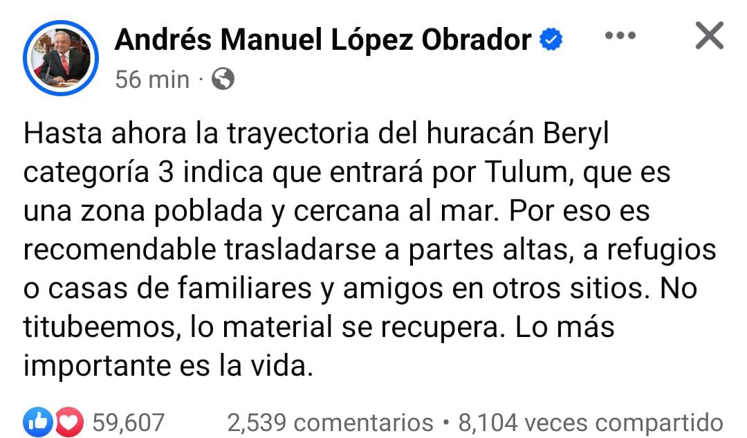 “Hasta ahora la trayectoria del huracán Beryl categoría 3 indica que entrará por Tulum, que es una zona poblada y cercana al mar. Por eso es recomendable trasladarse a partes altas, a refugios o casas de familiares y amigos en otros sitios. No titubeemos, lo material se recupera. Lo más importante es la vida”, escribió AMLO en su cuenta de X.