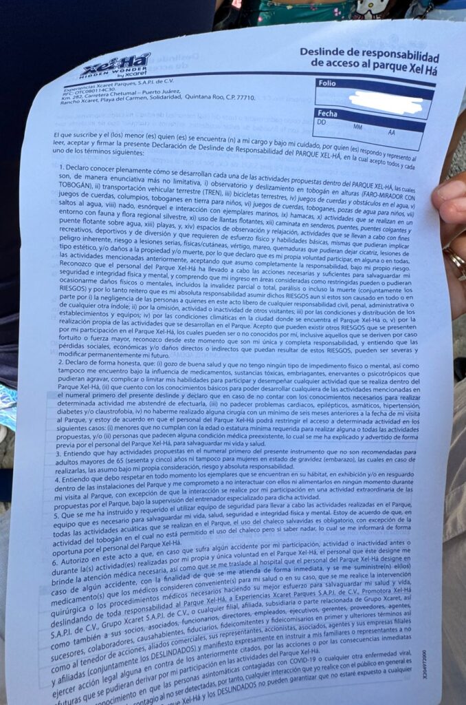 La carta deslinda de responsabilidad, en este caso, tanto al parque Xel-Há como a Experiencias Xcaret Parques S.A.P.I. de C.V., Promotora Xel-Há S.A.P.I. de C.V., Grupo Xcaret S.A.P.I. de C.V., o “cualquier filial, afiliada, subsidiaria o parte relacionada de Grupo Xcaret, asi como también a sus socios, asociados, funcionarios, directores, empleados, ejecutivos, gerentes, proveedores, agentes, sucesores, colaboradores, causahabientes, fiduciarios, fideicomitentes y fideicomisarios en primer y ulteriores términos así como al tenedor de acciones, aliados comerciales, sus representantes, accionistas, asociados, agentes y sus empresas filiales y afiliadas”. Cabe mencionar que personal de este parque exige a cada visitante que entregue esta carta firmada, misma que queda bajo resguardo de la administración.10:00 a. m.