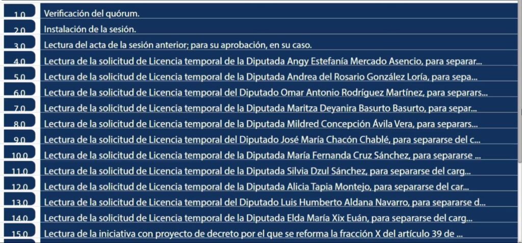 Lo anterior fue anunciado hoy por el mencionado presidente de la Jugocopo, Humberto Aldana Navarro, y confirmado poco después por el orden del día de la sesión ordinaria número seis del primer periodo del segundo año de ejercicio legislativo.
