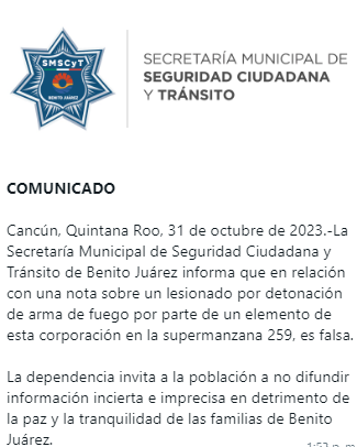 Cancún.- Trascendió que un elemento de la Policía Municipal de Benito Juárez hirió de bala en la pierna a un hombre, luego de detenerlo para practicarle una revisión, en el fraccionamiento Villas Otoch Paraíso de esta ciudad, sin embargo, instantes despues, la Secretaría Municipal de Seguridad Pública de Benito Juárez negó los hechos mediante el siguiente comunicado: